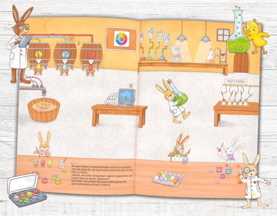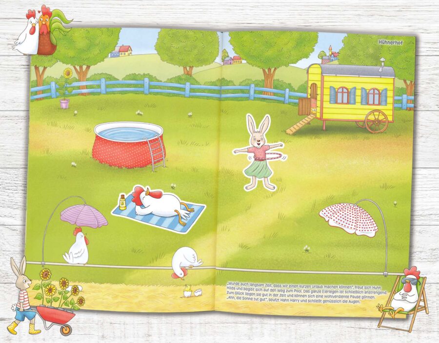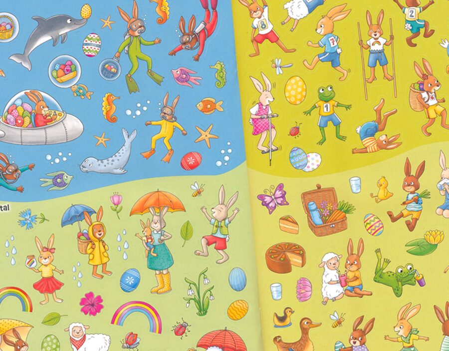 Sooo viele Osterhasen – Stickerspaß zu Ostern! Die Osterhasen sind schon voll und ganz bei der Sache und tun alles, damit das nahende Osterfest so reibungslos wie möglich verläuft. Ob in der Werkstatt, beim Picknick, beim Ostereier bemalen, beim großen Osterhasen-Theater oder in der Osterhasenschule … In den 13 Szenen kann nach Herzenslust geklebt, verziert und die das Osterhasenland zum Leben erweckt werden. Mehr als 300 Sticker mit Osterhasen und Häsinnen und ihren tierischen Helfern.